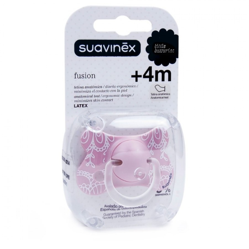 El chupete Suavinex Fusión con tetina anatómica está diseñado para bebés a partir de los 4 meses. Su arandela de tamaño reducido y forma innovadora armoniza con la cara del bebé, minimizando la superficie de contacto con la piel. Este chupete está disponible tanto con tetina fisiológica como con tetina anatómica. La tetina fisiológica, más estrecha y plana en la base, se coloca correctamente al succionar, facilitando la retención del chupete. Por su parte, la tetina anatómica imita la forma del pezón materno durante la succión. Este producto está avalado por la Sociedad Española de Odontopediatría y se encuentra disponible en 6 diseños distintos. Además, puede combinarse con los broches pinza y los biberones de la colección.